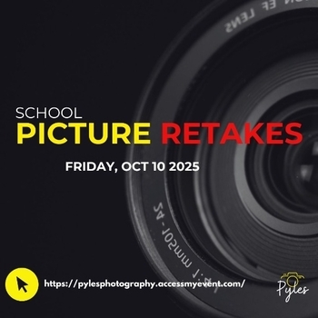 Pyles Photography will be doing picture retakes on Friday, October 10, 2025. All students should get an envelope back from the original picture day regardless if they originally ordered or not. Within the picture envelope are retake instructions. Students will need to bring back their original pictures and half of the package price will be due (unless the retake is a Pyles Photography error). For those who did not originally order pictures or a get sample packet, you can go online to http://www.pylesphotography.com/ to order. Or, pick up (or download) an order form from any school office.