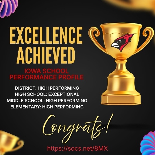 We are pleased to announce that Treynor CSD is rated as the highest school district in Southwest Iowa, according to the Iowa School Performance Profile (ISPP), with an overall rating of "High Performing". In addition, our elementary and middle schools were both rated "High Performing" while our high school earned the "Exceptional" designation. Notably, our high school has been the second-highest ranked high school in the state for two consecutive years. Furthermore, our elementary school has maintained a "High Performing" rating or higher for eight years running, and our middle school has earned its "High Performing" rating for five consecutive years.